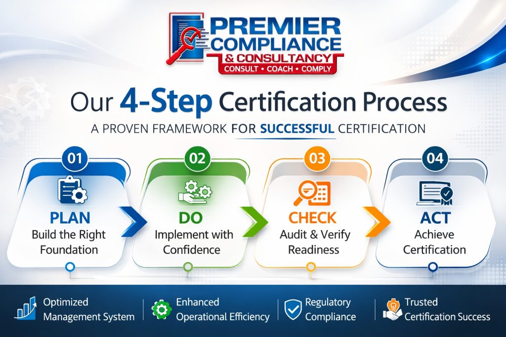 We simplify the journey to certification through a structured 4-step framework based on the globally recognized PDCA (Plan–Do–Check–Act) methodology.